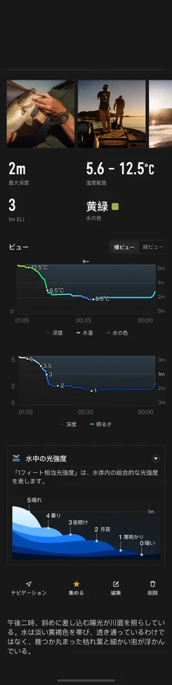 キャストのたびに、詳細データがCOROSアドベンチャーノートに自動記録されます。水深、水温、水色、水中の光強度、キャッチの瞬間の水況が、その場所にタグ付けされます。これは単なる記録ではありません。自分だけのフィールドの攻略本を、データと共に一冊ずつ築いていきます。