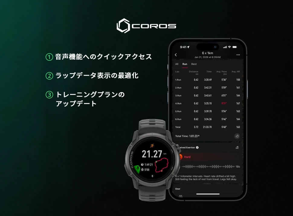 改良されたラップサマリー、COROS DURAでのマップ視認性向上、そして直感的に使えるボイストレーニングノートの追加。お使いのデバイスに加わった新機能をご確認ください。
