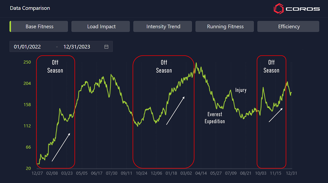 COROSアプリ内のベースフィットネスチャートでデータを比較すると、明確な傾向が見えてきます。