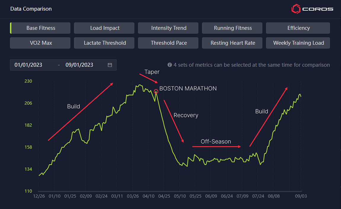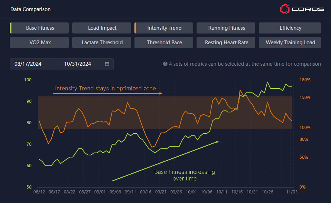 レース前に十分なベースフィットネスを構築できたかどうかを判断するには? ベースフィットネスは非常に個人差の大きい指標であり、数値が高くなるほど生活上のストレス要因も大きく影響してきます。プロアスリートが COROSベースフィットネス指標をどのように活用しているかについてのケーススタディ記事もぜひ参考にしてください。この指標をどのように調整してトレーニングに活かしているかを理解することができます。
