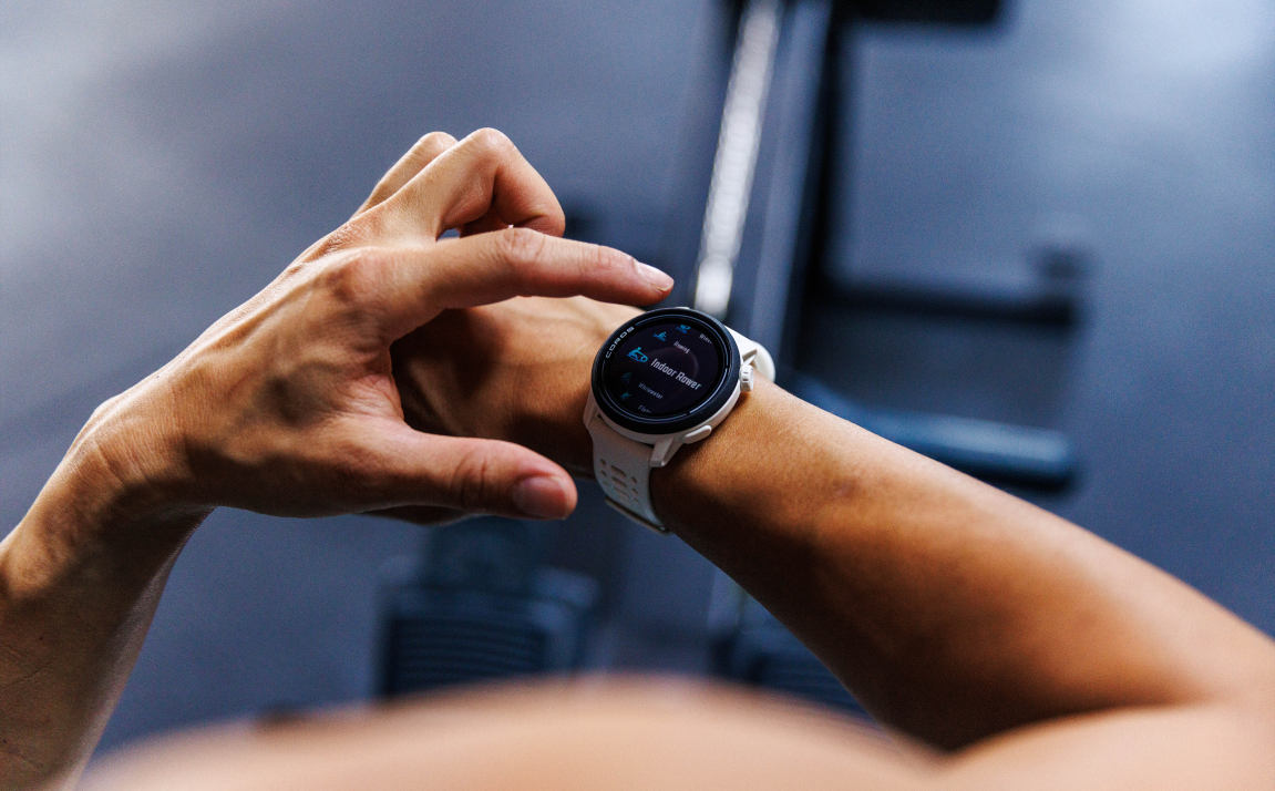 室内でトレーニングする際には、COROSのスマホ表示機能を使用して、リアルタイムデータ(心拍数やペースなど)をスマートフォンで直接確認することができます。始めるにはウォッチでアクティビティを選択し、次にCOROSアプリを開いて左上隅のウォッチアイコンをタップします。