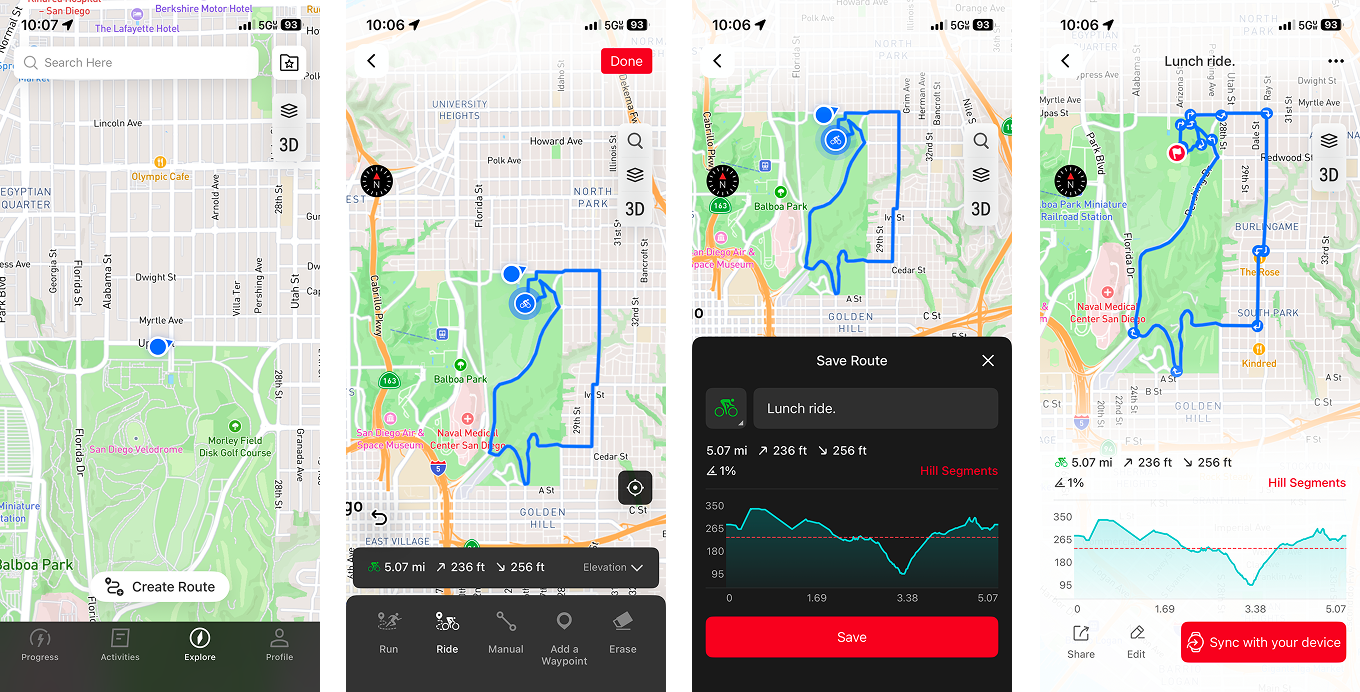 COROSアプリを開き、「ルート」タブに移動します。そこから数分でルートが作成できます。COROSのルート作成では、ルート上に詳細なウェイポイントが作成でき、トイレ、給水、補給、キャンプ場などの重要な地点をマークすることができます。