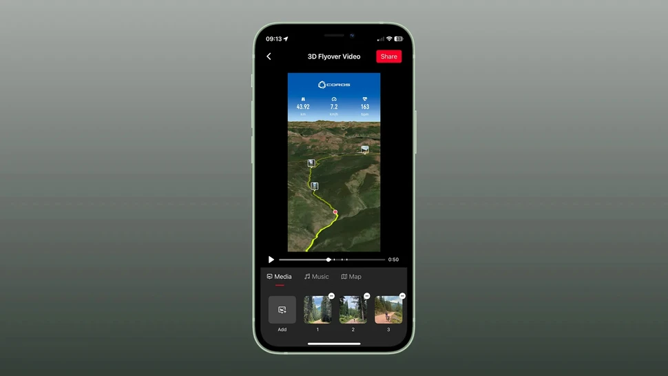 COROSアプリであらゆるアウトドアアクティビティを表示する際、3Dフライオーバー機能が利用できます。共有アイコンをタップして「3Dフライオーバー動画」を選択するだけです。その後、共有または保存前に、メディアや音楽、スタイルがカスタマイズできます。