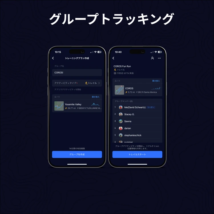 メンバー全員がCOROSデバイスでアクティビティを開始すると、アプリで自分の位置情報とデータがメンバーとリアルタイムで共有できます: