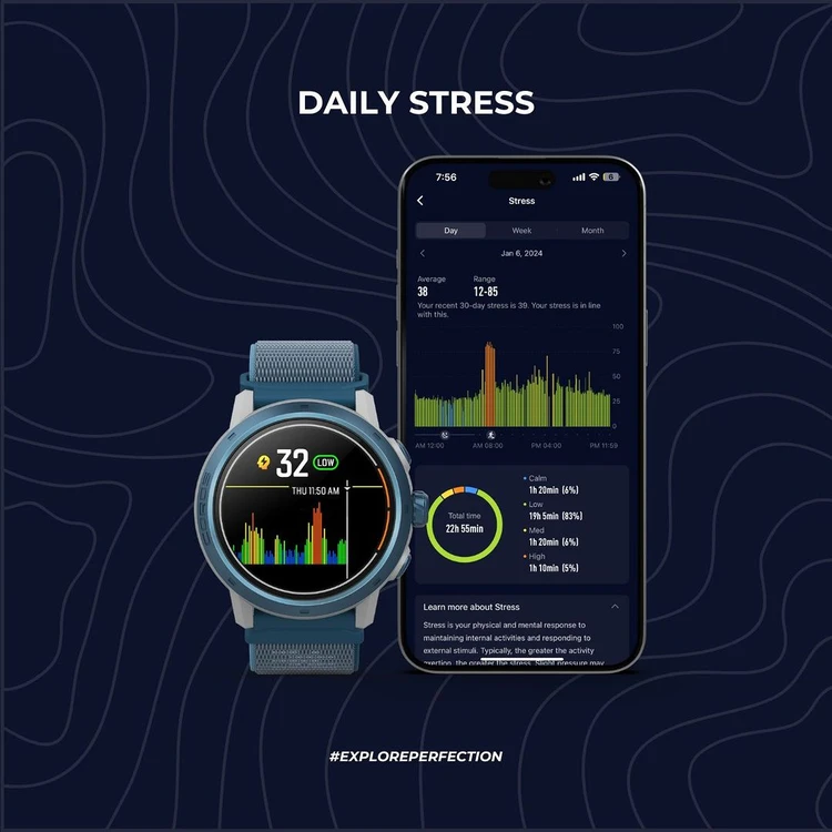 ストレスは、COROSウォッチの着用時に自動測定されています。光学式センサーが5分ごとにデータを収集し、1日間のストレス数値を算出します。ユーザーのストレス評価に関する概要や詳細はCOROSアプリのホームページから確認できます。
