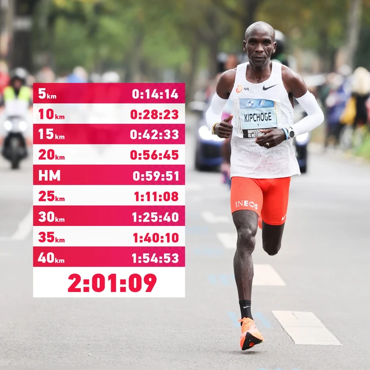 2022年ベルリン: 史上最高の持久系パフォーマンスが繰り広げられています。キプチョゲはこの5kmをその前よりもやや速いペースに。2018年のネガティブスプリットには及ばないものの、今回は2分53-55秒/kmで安定していました。2分40秒台半ばの高速ペースでレースは始まり、驚異的なハイペースで中間点を通過した後もキプチョゲは力強いケイデンスを刻みながら、目の前のタスクに集中し続けています。