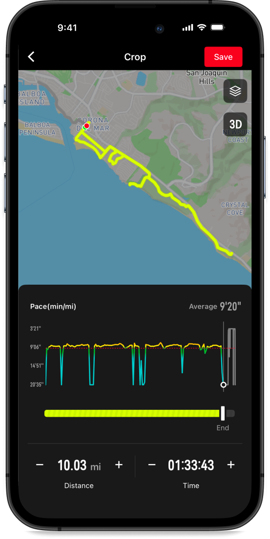 COROSアプリでは、アクティビティ概要画面の右上にある「トリミング」を選択して、スライダーで正確に終了地点を指定するだけで不要な区間をカットできます。記録をきれいに整えて、統計データの精度を保ちましょう。