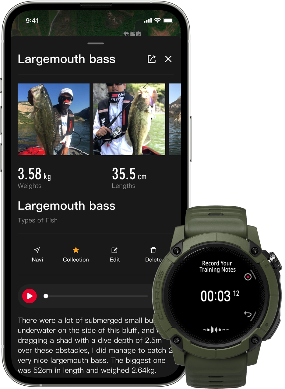COROS NOMADの音声記録は、直感的ですぐに使える設計。釣りに集中したいアングラーに最適な機能です。