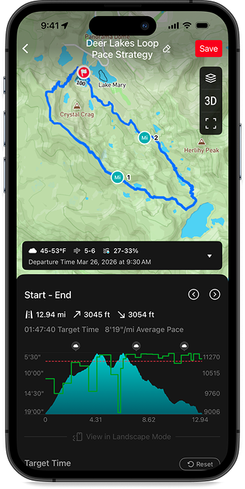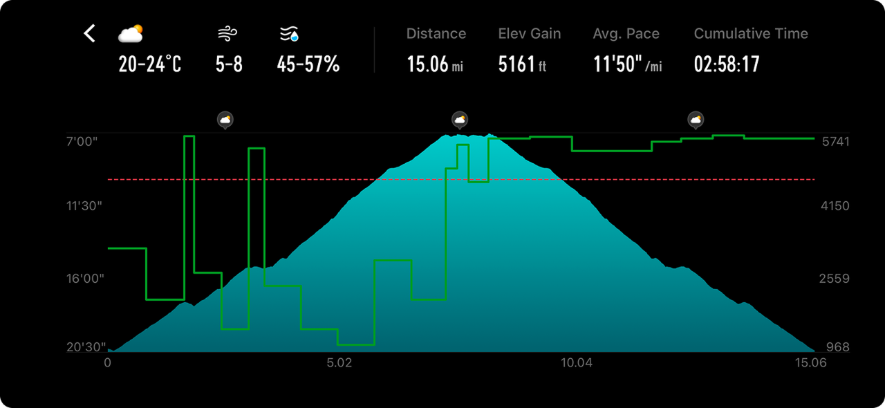 - 天気情報:レースでは、環境要因が勝敗を左右することがよくあります。ペース戦略機能は、ルートの各セグメントごとに現地の天気データを取得します。レース日が近づくにつれて、特定の上り坂が熱波や寒波に見舞われるかどうか、日没時刻などを確認し、ヘッドランプを持って出発するエイドステーションが計画できます。