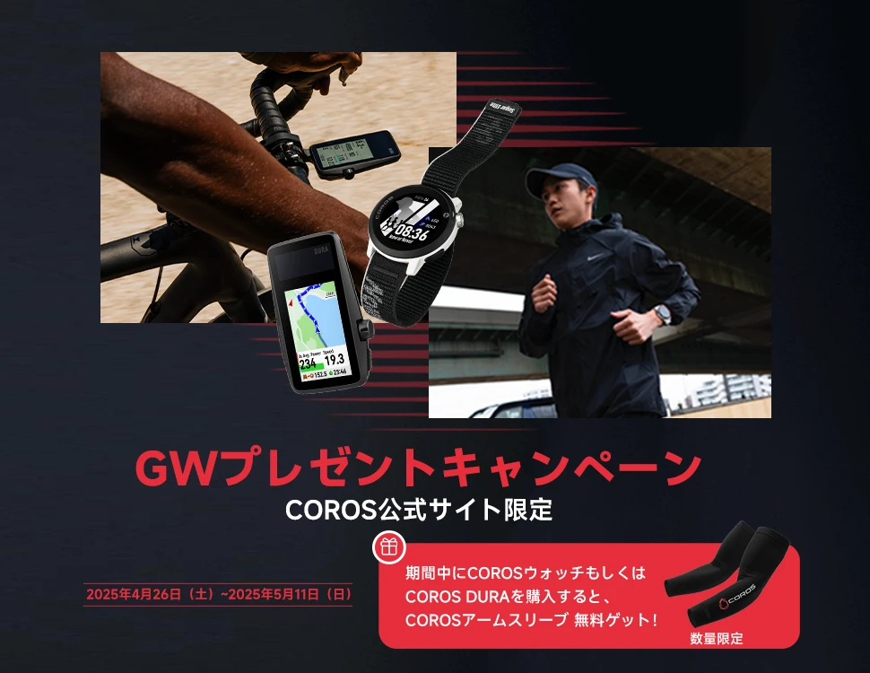 2025年4月26日(土)~2025年5月11日(日)の期間中に、COROS公式サイト:jp.coros.com でCOROS ウォッチもしくはCOROS DURAとアームスリーブをカートに入れて、お買い上げいただくと、数量限定の「COROSアームスリーブ」を無料ゲットできます。